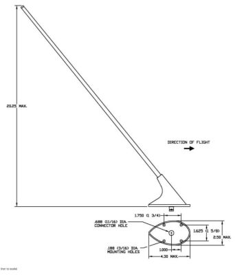 The AV-10 is designed for high-performance aircraft applications. It exhibits excellent electrical characteristics and incorporates an efficient aerodynamic 4-bolt mounting base. The antenna essentially matches the styling of the communication antennas currently used on most singles and light twins. The antenna is designed to operate at speeds up to 350 mph and altitudes up to 50,000 ft. It has a drag force of 2.70 lb @ 250 mph.