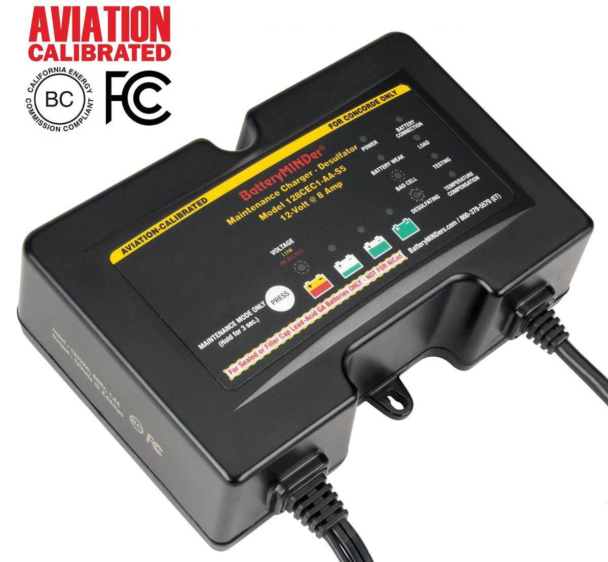 These chargers-maintainers-desulfators are designed for all size and type 12-Volt Concorde® Aviation Batteries. If you want the longest possible life and performance from your batteries there is no other product better at doing just this and BatteryMINDer® Guarantees it! In addition to charging and maintaining all 12V Concorde® sealed or wet cell (filler caps) aviation batteries users can now determine the level of charge remaining in their battery, and if weak and in need of replacement, before going bad. Units test for weak/dead cells and will recover weak or severely discharged batteries that other chargers would reject. Known as the CEC1-AA series they feature advancements in easy to understand battery analysis and condition not previously available in any other single model. Their high efficiency design, controlled by industrially-rated microprocessors, allow continuous operation (24 hrs./day) for less than $0.43/month*. Temperature sensors prevents over/under charging from freezing to 130-F.