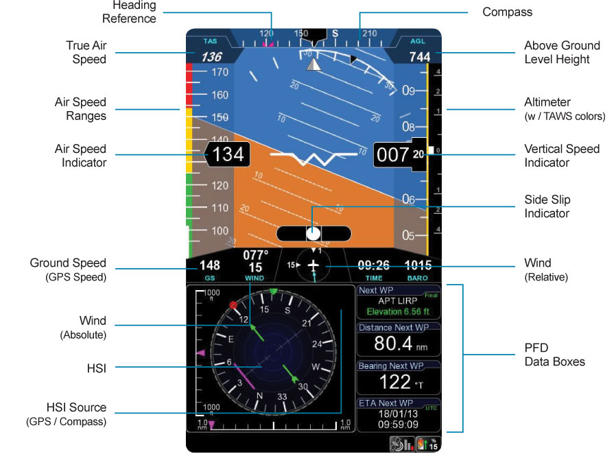 - Integration of TAWS into the PFD with AGL Altitude indication
