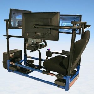 | The Pilot Pro 4 is a full 180 degree view from the cockpit seat simulator. The forward view is a 42″ Wide Screen in stunning HD, the left and right views are 32″ HD wide screens and the lower 22 inch HD screen displays the Instrument Cockpit. The fully adjustable fabric Pilot in Command seat ensures hours of comfortable flight.